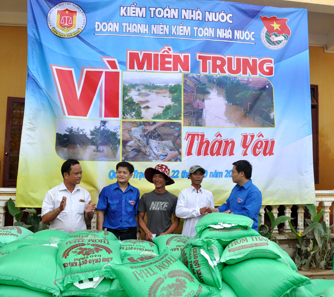 Chia sẻ với bà con về ý nghĩa của chuyến đi, đồng chí Ngô Đạt Trí - Bí thư Đoàn TN KTNN, Trưởng đoàn công tác cho biết: Trong nhiều năm qua, mỗi đoàn viên thanh niên, mỗi chi đoàn trực thuộc Đoàn TN KTNN đều chủ động tổ chức các hoạt động tình nguyện vì cuộc sống cộng đồng ở nhiều địa bàn khó khăn trên cả nước. Hàng trăm triệu đồng đã được quyên góp với nhiều chương trình từ thiện hết sức ý nghĩa: thăm và tặng quà các bà mẹ Việt Nam anh hùng, xây dựng nhà tình nghĩa, ủng hộ đồng bào bị ảnh hưởng của thiên tai, đau ốm, khó khăn… Và hôm nay, trước những khó khăn của người dân xã Phù Hóa trong trận bão lũ lịch sử, với tinh thần tương thân tương ái, mỗi đoàn viên thanh niên của KTNN đã cùng chung tay vì miền trung thân yêu, mong rằng bằng những món quà tuy còn nhỏ về vật chất nhưng thấm đượm tình người KTNN sẽ phần nào làm vơi đi những khó khăn, nhanh chóng khắc phục bão lũ, ổn định cuộc sống.